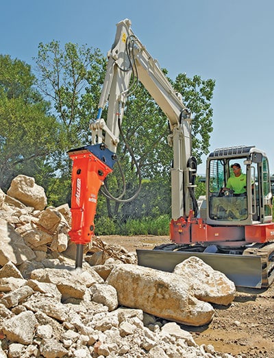 “The first thing that needs to be considered to determine if a breaker will be compatible with a compact excavator or skid steer is the lifting capacity and weight of the carrier to the weight of the breaker,” says Greg Smith, marketing communications manager at Allied Construction Products. “Once you have determined that the carrier can lift and position the breaker in all of its reach positions, you know that the compact excavator or skid steer can physically handle the breaker.”