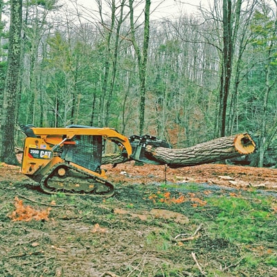 Byrne has one 299D XHP loader running on steel tracks for certain operations, but the others ride on rubber. The Bobcat loader is fitted with Solideal rubber tracks that Byrne believes give better traction, though they might not wear as well. Byrne says he normally gets 900 to 1,000 hours between track replacements as his machines work the slopes and rocks of upper New York.