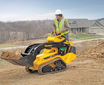 The Vermeer CTX50 boasts a 600-lb ISO-rated operating capacity and a tipping capacity of 1,715 lbs due to its vertical-lifting path. The vertical-lift path is designed to keep the load closer to the machine, allowing it to lift more than a similar-sized compact tool carrier with a radial-lift path. A vertical-lift path also provides a higher lift height. These enhancements along with the Vermeer exclusive single pilot-operated joystick and stand-on platform make the CTX50 a game-changer in the rental and landscape market.