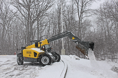 So the versatile compact telehandler has expanded its presence in construction, landscaping and animal husbandry-ag industries. The expansion continues. “I can tell you a lot of construction contractors may have gotten one of these machines for homebuilding projects, to lift some lumber, maybe do some dirt work,” says Connor, “but they are moving snow in the winter with it, too.”