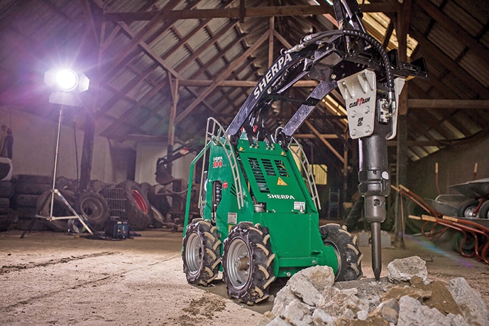 A Tibetan people called Sherpas made a name for themselves carrying equipment for mountain climbers in Nepal. Now a machine called Sherpa is making a name for itself as a tool carrier and creating a market for new attachments. The currently most popular tools for it are a grapple bucket and a hydraulic hammer, but a unique vacuum lift attachment is gaining converts, too.