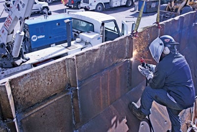 For long cutting jobs, such as this 4- x 12-ft. stainless steel panel, the combination of a Trailblazer 302 Air Pak and Spectrum plasma cutter improve CMW Welding’s job site productivity.