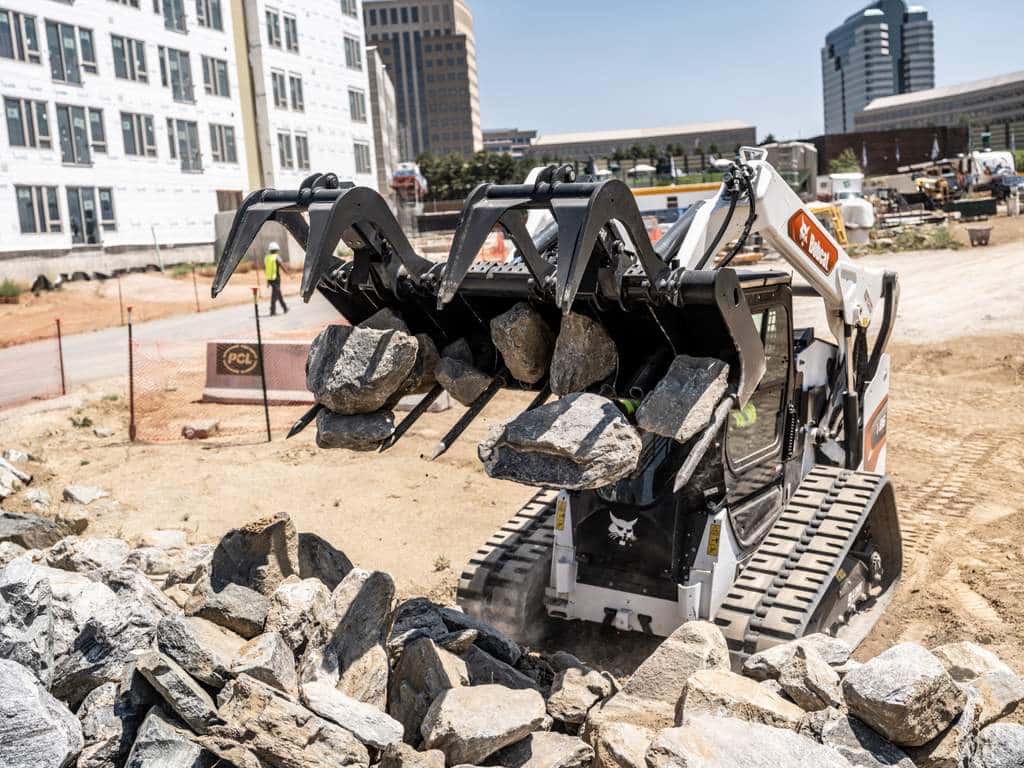 Bobcat also shows how compact loaders fit concrete workflows. The T86 compact track loader runs a 96-in. grader blade with laser control. That setup targets base prep and fine grading. The S66 skid steer appears with a concrete mixer. The L95 compact wheel loader carries a standard bucket for material handling. The MT120 mini track loader runs a nitrogen breaker. This points to interior demo and limited-access jobs.