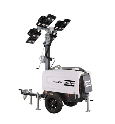 Atlas Copco’s HiLight V5 below features a compact diesel engine and a flexible vertical mast, which result in a small footprint, fitting as many as 20 units on a 53-ft trailer.