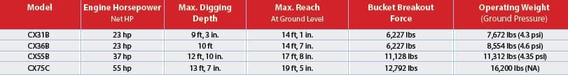 The CX31B and CX36B feature 23-hp engines with maximum digging depths of 9 ft, 3 in. and 10 ft, respectively. The 7,672-lb CX31B offers a bucket breakout force of 6,227 lbs, while the 8,554-lb CX36B also features a breakout force of 6,227 lbs. The CX55B provides a 37-hp engine and an operating weight of 11,312 lbs, and offers greater reach, 11,128 lbs of bucket digging force and a digging depth of 12 ft, 10 in.