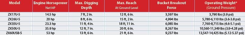 Hitachi’s compact excavator lineup includes the ZX17U-5, ZX26U-5, ZX35U-5, ZX50U-5 and ZX60USB-5. The ZX17U-5 and ZX26U-5 are the smallest excavators Hitachi sells in North America. These tiny titans are nimble, powerful and designed to keep their tails close to their tracks rather than bashing into fences or walls. The company has reduced the size and footprint without sacrificing the Hitachi qualities customers have come to expect — long life, high productivity, multifunction operations, smooth hydraulics and easy maintenance, says Hitachi.
