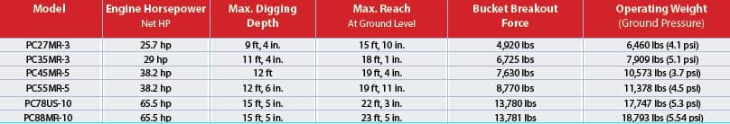 The Komtrax machine monitoring system, provided at no additional cost, allows managers to track machine usage, location and fuel consumption. Komatsu compact excavators have large excavator size features, says the company, such as steel castings in high stress areas — such as the boom foot and tip — for long equipment life. Komatsu notes that its excavators are distinguished by the Komatsu-designed and -manufactured components that maintain the legendary quality and reliability for which Komatsu is known.