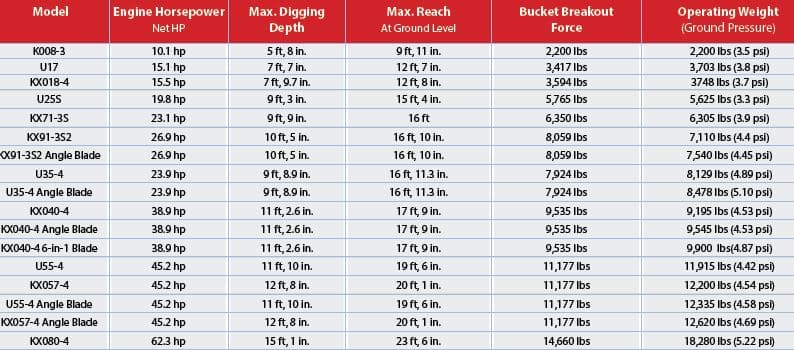 Decades ago, Kubota released its first excavator, and today its machines range from 1 to 8 tons. Models with zero, tight or conventional tail swing are available with an offering of 10 to 70 gross hp. Kubota’s KX-Series excavators have earned high market acclaim, says Kubota. The KX080-4 delivers a breakout force of 14,660 lbs, with the KX057-4 offering a powerful 11,177 lbs and the KX040-4 serving up 9,535 lbs.