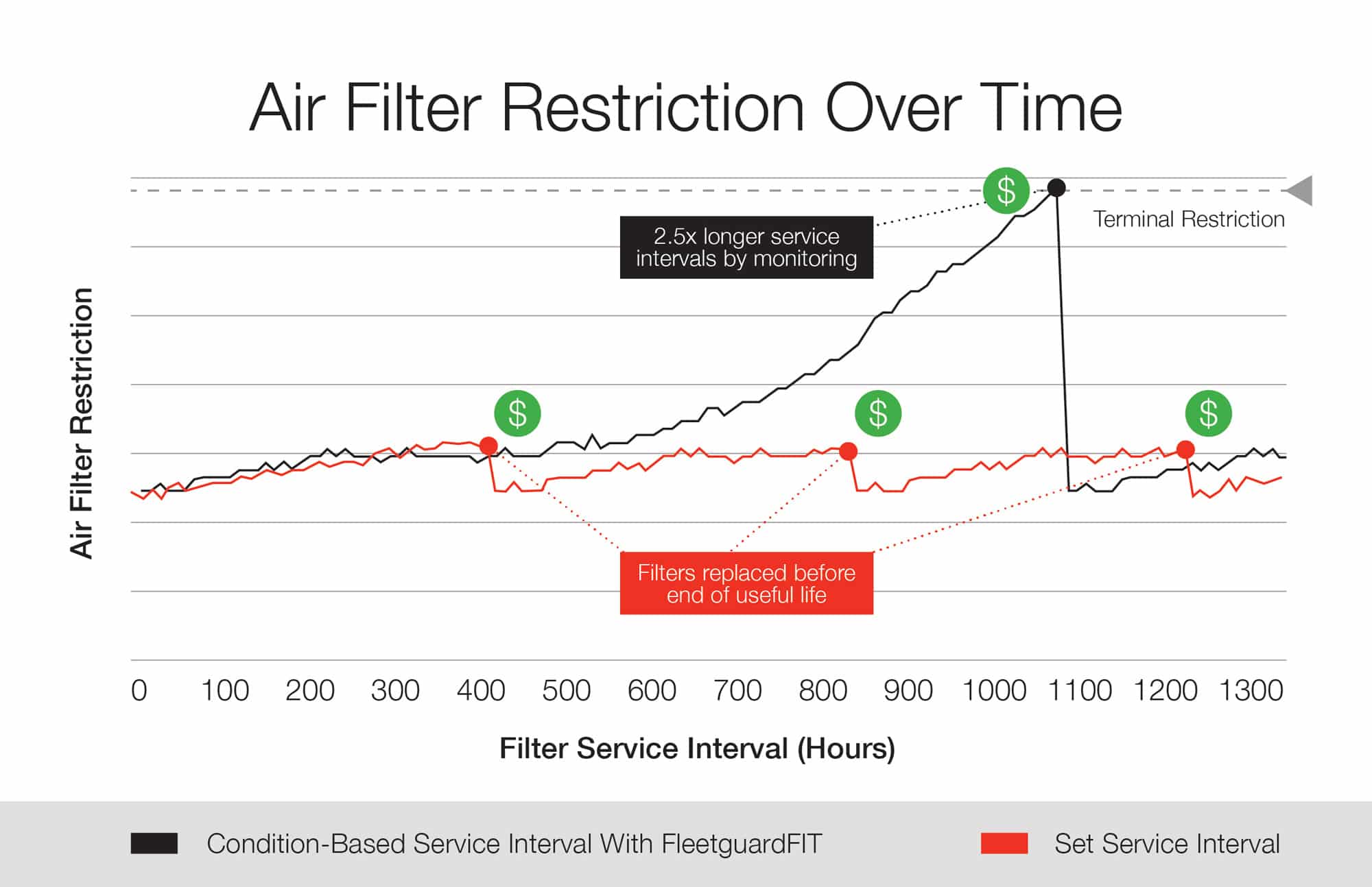 The graph below shows an example of the effectiveness of condition-based monitoring in a mining haul truck, using air restriction sensors. The mining operator had been changing air filters every 400 hours but was able to safely extend their use to more than 1,000 hours by using the FleetguardFIT® real-time monitoring solution. As a result, the user was able to extend air filter service intervals by two and a half times, resulting in a 60% reduction in filtration maintenance costs per year.