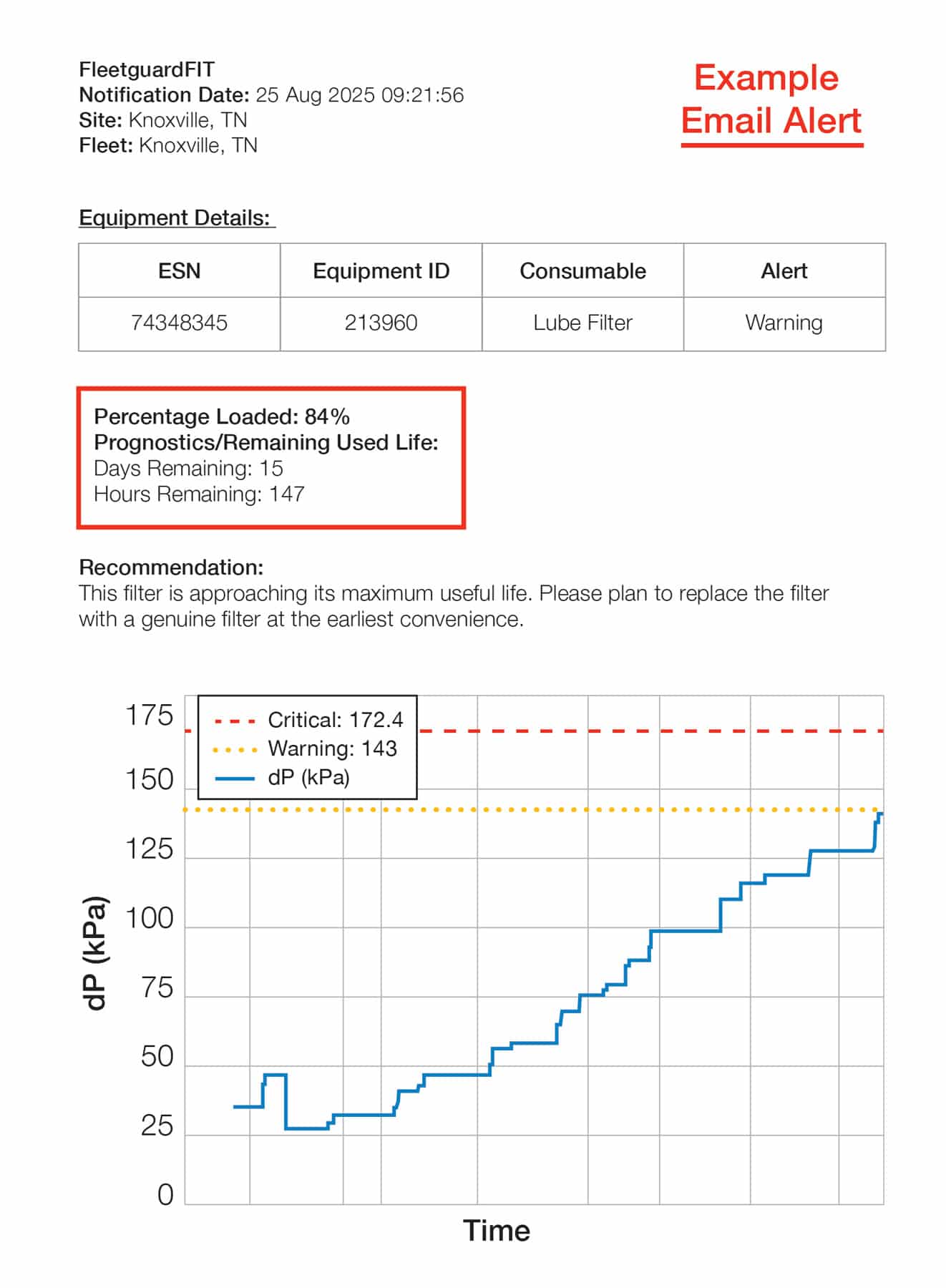 - Future issue: An air filter is 85 percent loaded and will need to be changed soon