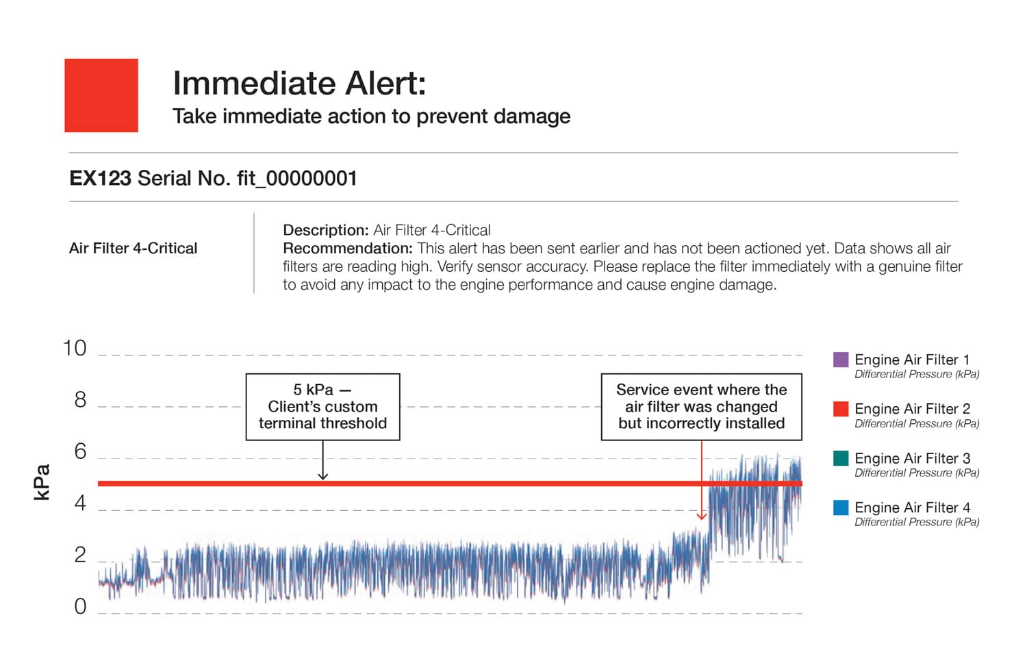 For example, a timely critical alert prevented a catastrophic engine failure on a dual engine excavator. A sudden spike in air filter differential pressure exceeded the company’s maximum threshold. Investigation revealed that a technician had installed the new air filters incorrectly, allowing dust to bypass the outer element. Early detection saved the company approximately USD $1.17 million (€1.08 million) dollars in parts, labor and downtime.