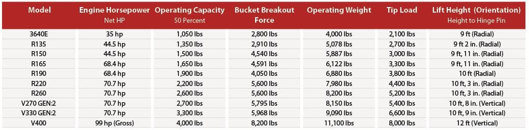 The small- to medium-frame family includes the hard-working, durable 3640E, R135, R150 and R165 skid loaders. These models feature strength relative to the most compact dimensions in the industry, notes Gehl. With engines rated from 35 to 68.4 hp and clearance circles (including bucket) from 69.4 to 73.6 in., these machines offer power in a compact frame.