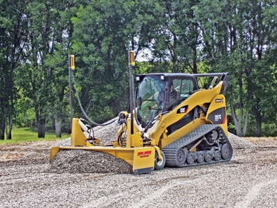 When it comes to site preparation specifically, compact track loaders are maybe the smallest, most productive precision grade machines on the market. All you need is the addition of a machine control system. Attach a grading attachment, equipped with masts, lasers, a control box and maybe a global positioning system (GPS) or universal total station (UTS) system, and you can control elevation and grades with an accuracy of ¼ of an inch.