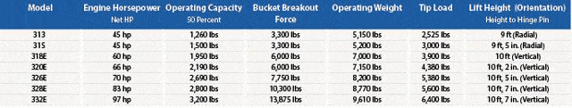 The 318E, 320E and 326E models incorporate a roomier operator station, a quieter pressurized cab with good visibility and a curved-glass, swing-out door, says Deere. Operators also have a choice of numerous productivity-boosting options, including electro-hydraulic joysticks with selectable control pattern and variable boom and bucket speed settings. Additional features include a highly efficient and easy-to-clean V-plenum cooling system and an electronic fuel-injected diesel engine that is Tier 4 Interim certified. Grouped checkpoints, advanced diagnostics and wide-open access help speed servicing, minimize maintenance and lower daily operating costs.