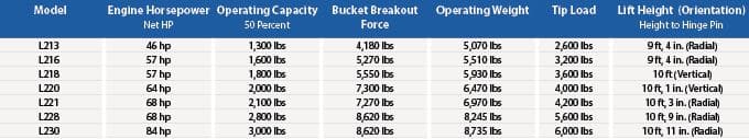 The 200 Series skid steer loaders include seven models. The L218, L220, L228 and L230 skid steer loaders feature the patented vertical-lift Super Boom design, delivering forward dump height and reach. The 200 Series also includes three models — L213, L216 and L221 — which feature a radial-lift design, providing excellent digging performance.