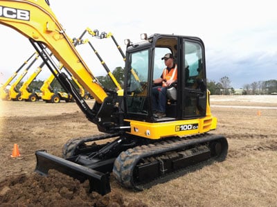 CE publisher Keith Gribbins operates the 10-metric ton conventional tailswing compact excavator dubbed the 100C-1 at JCB’s recent media days.
