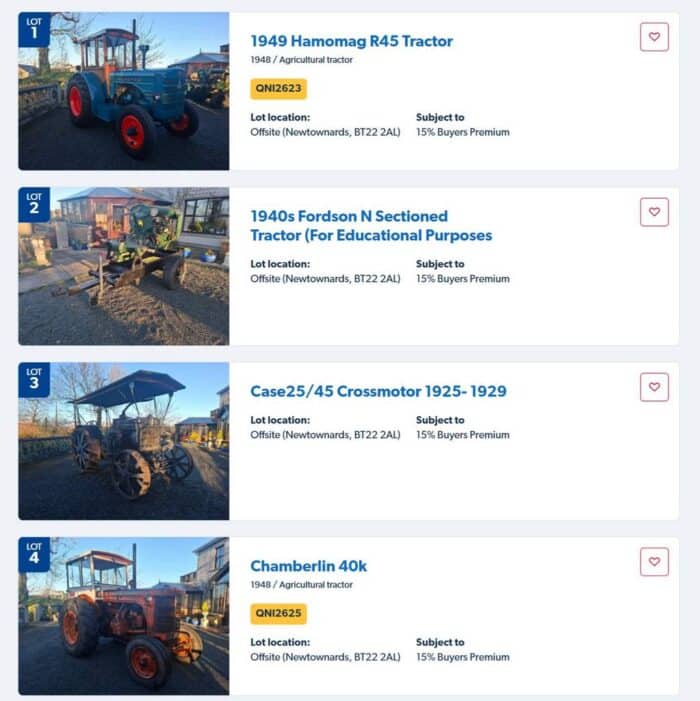 The Vintage Tractor Collection Auction runs from Wednesday, January 28 at 2:00 p.m. through Friday, January 30 at 2:00 p.m. It is a timed online auction. All lots are located offsite in Newtownards, Northern Ireland. Each lot carries a 15 percent buyer’s premium. In-person viewing is scheduled for Monday, January 26 from 10 a.m. to 5 p.m.
