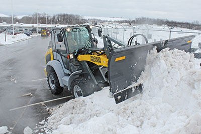 Compact wheel loaders have become popular for snow removal operations in areas like Michigan, Ohio and Illinois. They work well in mall and shopping center parking lots because of the operator’s visibility and ability to get into tight areas. They can also be easily driven on the street from project to project. If an operator has three or four parking lots to clear along the same street, it’s very easy to clear those lots with a compact wheel loader and 12-ft blade, both of which can travel down the street to the next job. With a higher operator station, articulation or all-wheel drive and a quick-attach plate to utilize attachments, compact wheel loaders can go from loading dirt to plowing snow, placing pallets of cold brick to removing ice with a broom, spreading salt and brine to augering holes under the summer sun.